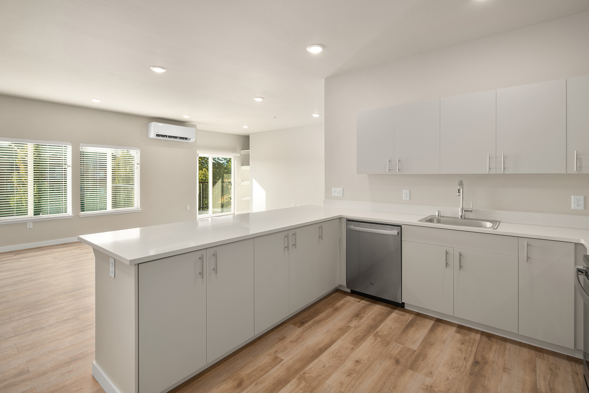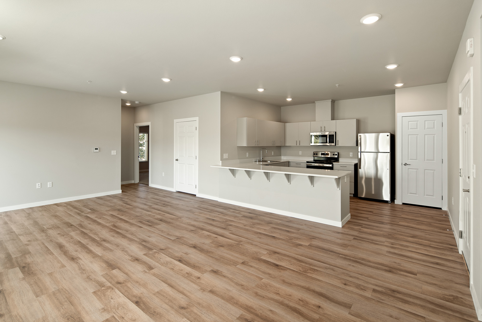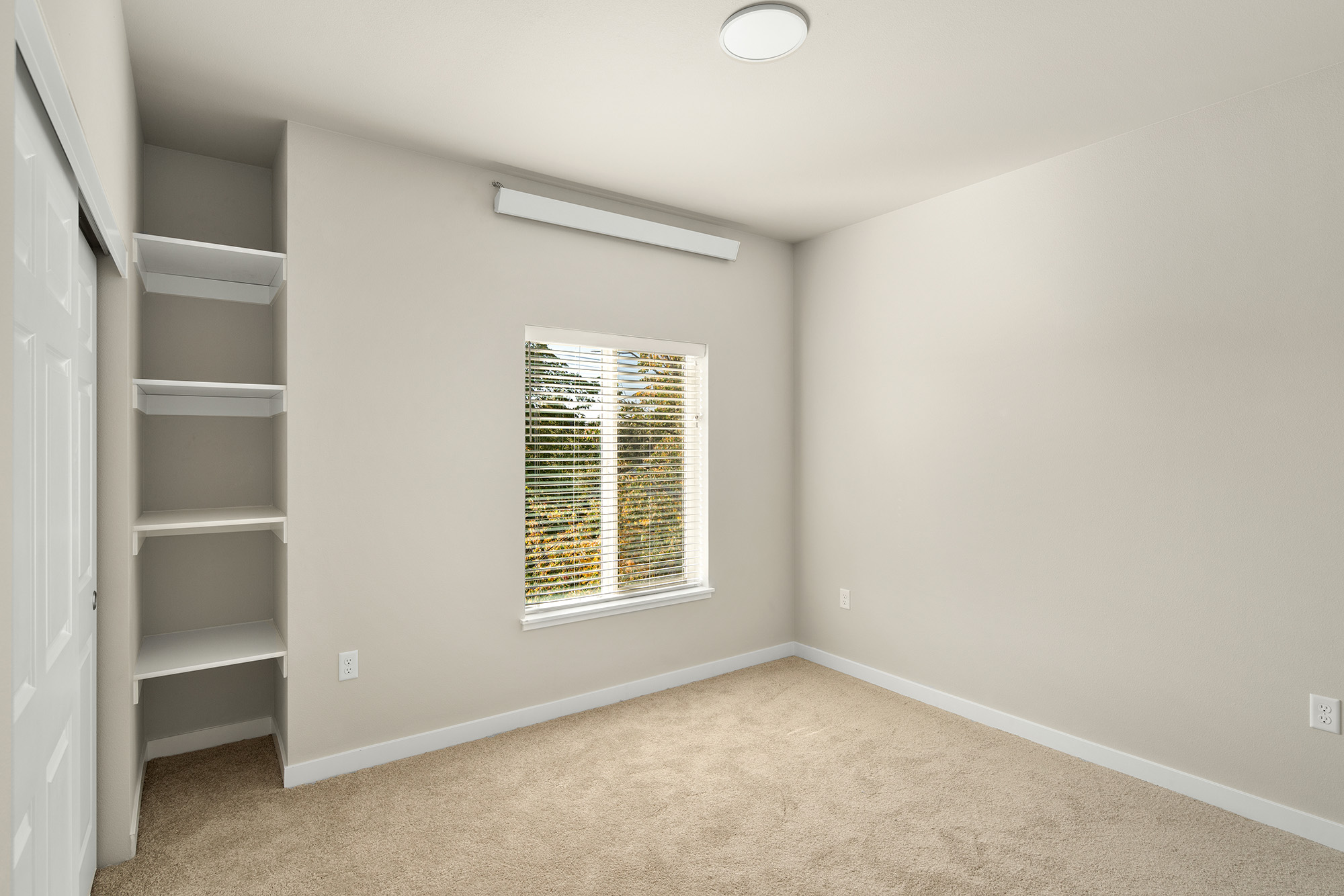 These two-bedroom, two-bathroom apartments are in Spokane Valley, WA. Each unit features generous living areas, a private patio, and ample storage throughout. The primary bedroom includes a spacious closet with built-in shelving and direct access to a full private bathroom. Thoughtful layouts and quality finishes make these residences well-suited for a variety of lifestyles.