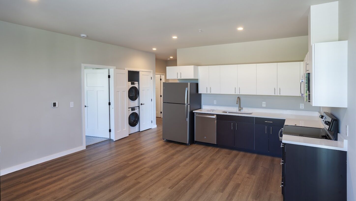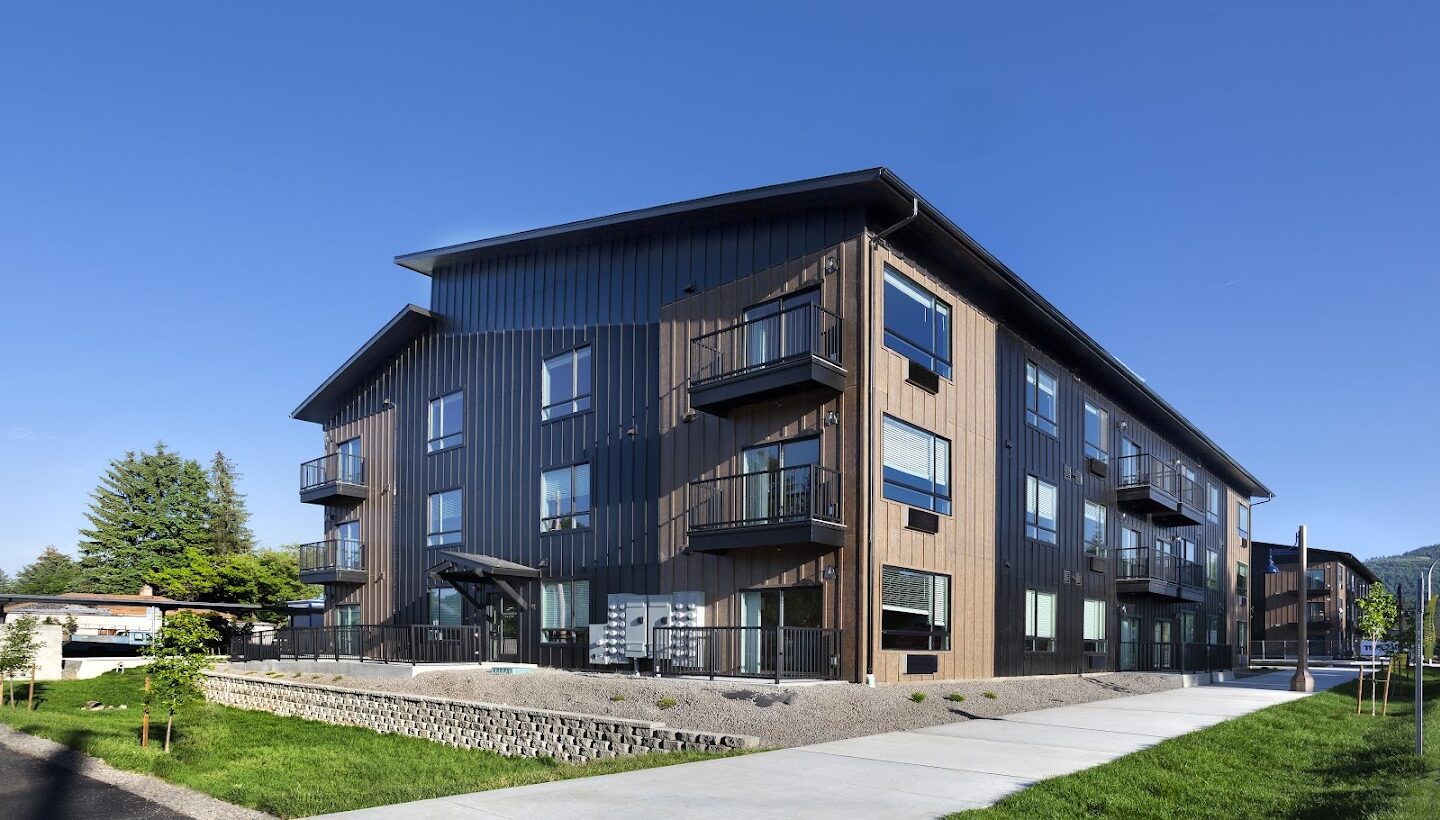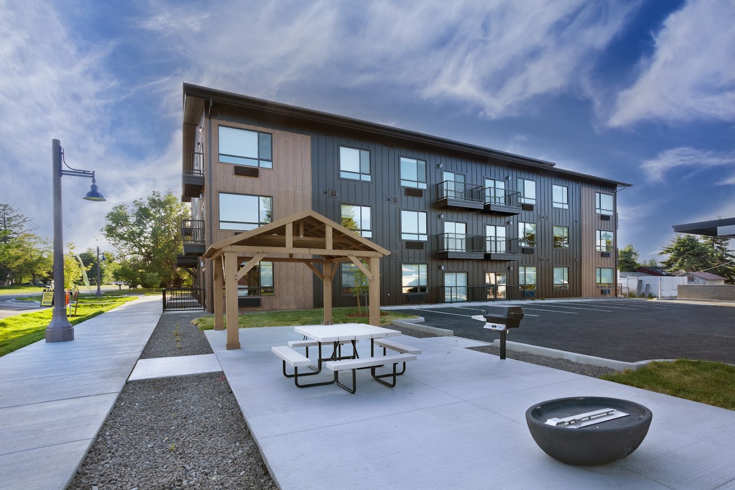 Completed in 2023, this 12-unit apartment building marks the first of a three-building residential project. Thoughtfully located in the heart of Post Falls, the development features a mix of studio, one-, and two-bedroom units, designed to accommodate a variety of lifestyles. Outdoor seating areas and a covered pavilion provide shared spaces for relaxation and community gatherings.